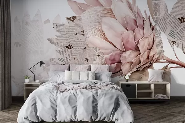 Protea flowers, newspaper art, floral, tropical, pastel beige colors - Wall mural (No. w03667v4)