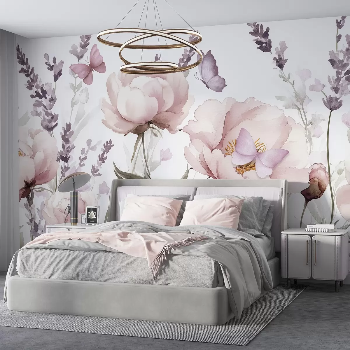 Flower meadow, peonies, lavender, butterflies, watercolor style, pink colors - Wall mural (No. w03668)