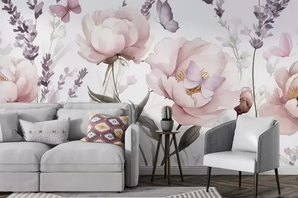 Flower meadow, peonies, lavender, butterflies, watercolor style, pink colors - Wall mural (No. w03668)