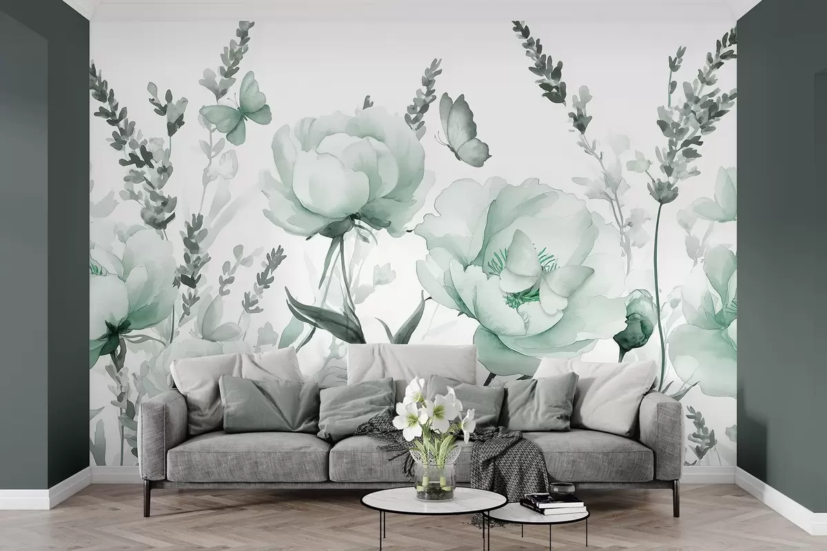 Flower meadow, peonies, lavender, butterflies, watercolor style, green colors - Wall mural (No. w03668v1)