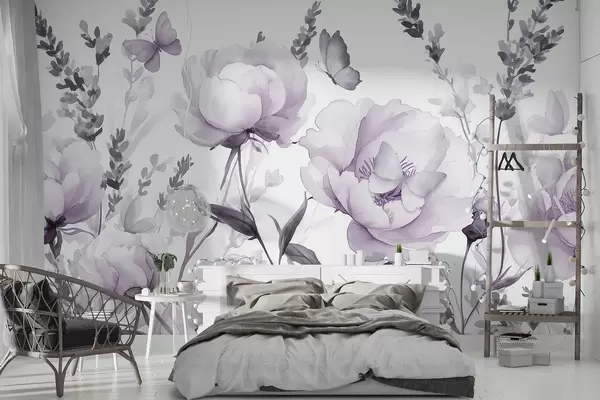 Flower meadow, peonies, lavender, butterflies, watercolor style, puple colors - Wall mural (No. w03668v3)