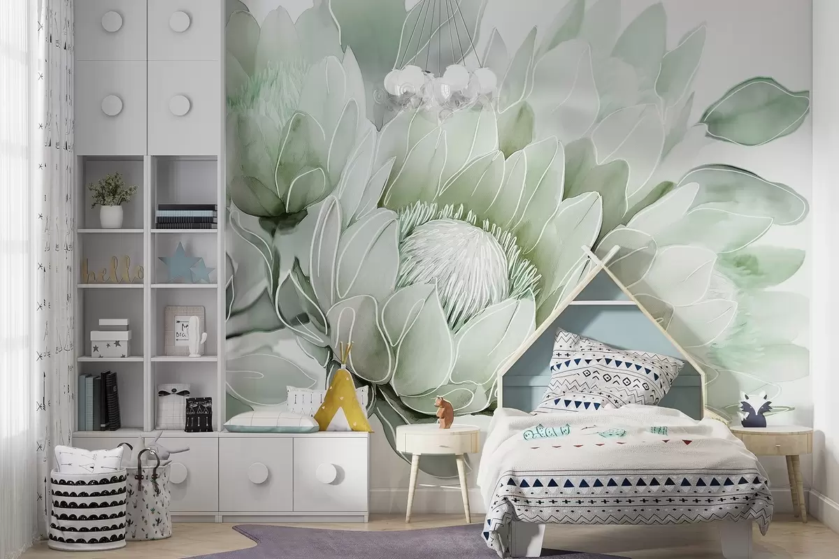Beautiful protea flowers, line art drawing, tropical, green colors - Wall mural (No. w03669v2)