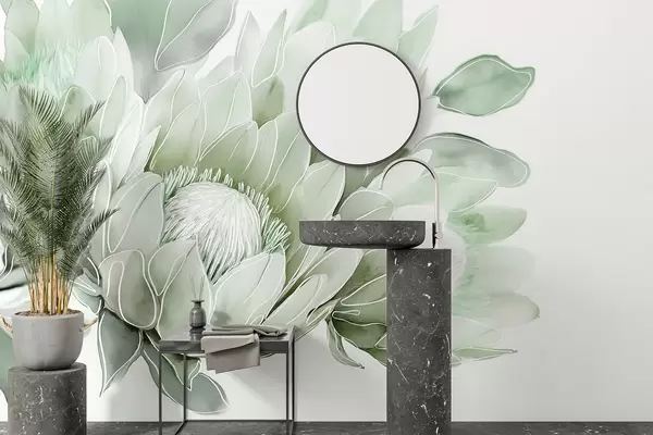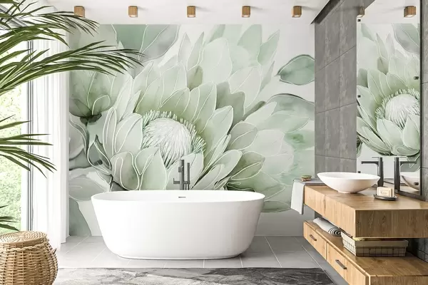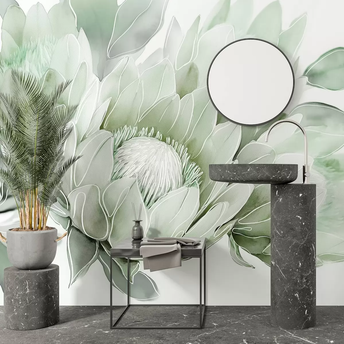 Beautiful protea flowers, line art drawing, tropical, green colors - Wall mural (No. w03669v2)