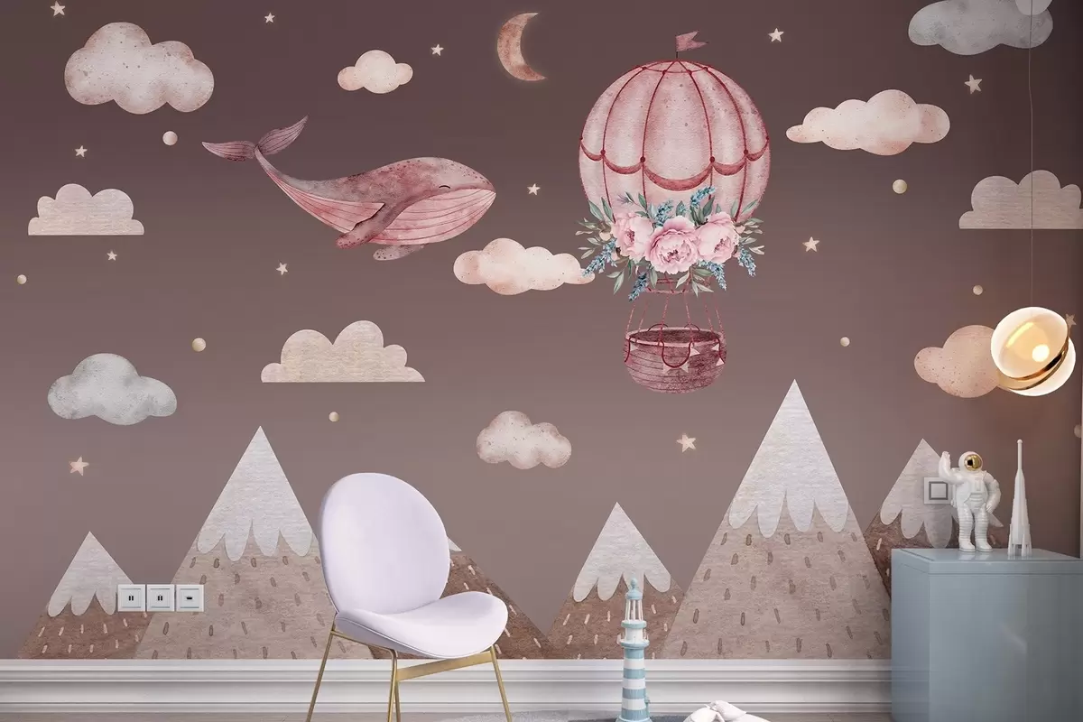 Cute whale with air balloon, dark sky with clouds, mountains, watercolor, pink colors - Wall mural (No. w03673v1)