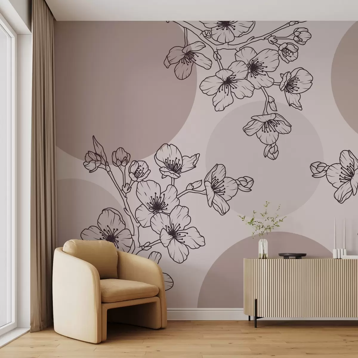 Branches with flowers on colored circles in brown tones - Wall mural (No. w03712)
