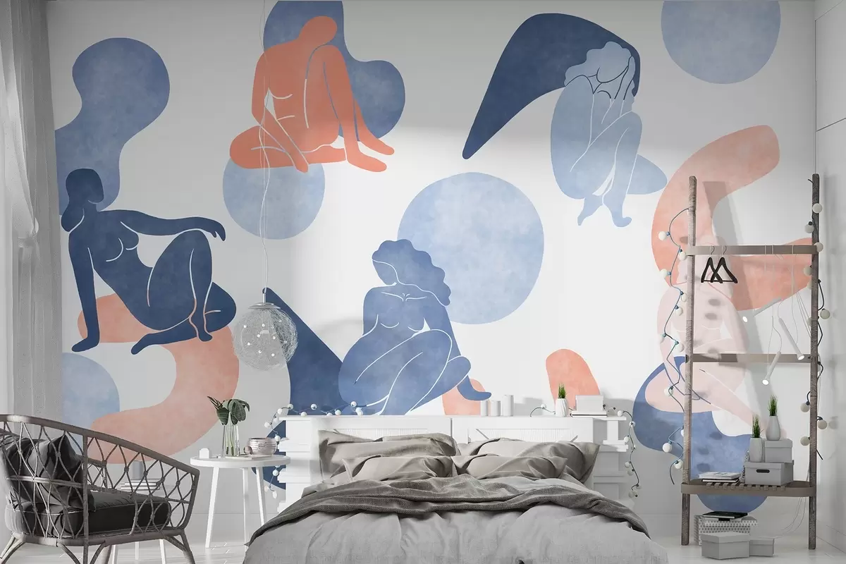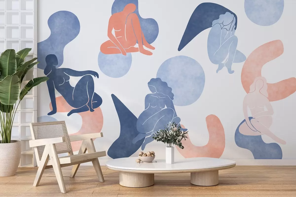 Geometric abstractions with women silhouettes, boho style, blue, beige, pink - Wall mural (No. w03753v1)