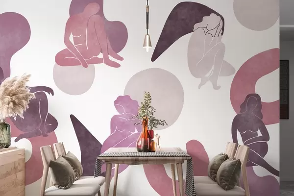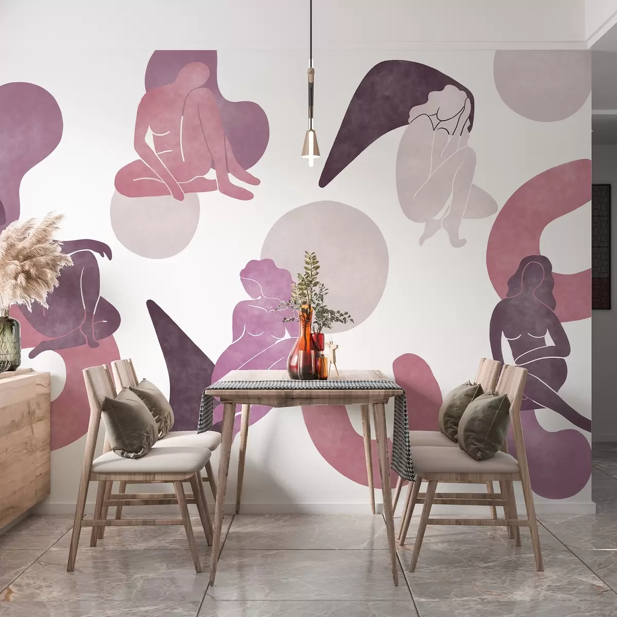 Geometric abstractions with women silhouettes, boho style, pink, beige, purple - Wall mural (No. w03753v3)