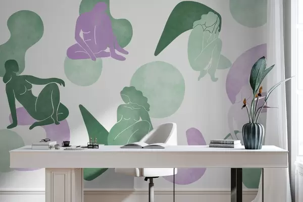 Geometric abstractions with women silhouettes, boho style, purple, green - Wall mural (No. w03753v4)