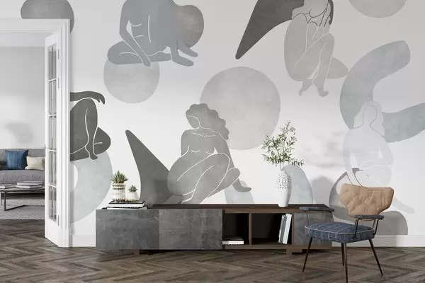 Geometric abstractions with women silhouettes, boho style, grey colors - Wall mural (No. w03753v5)