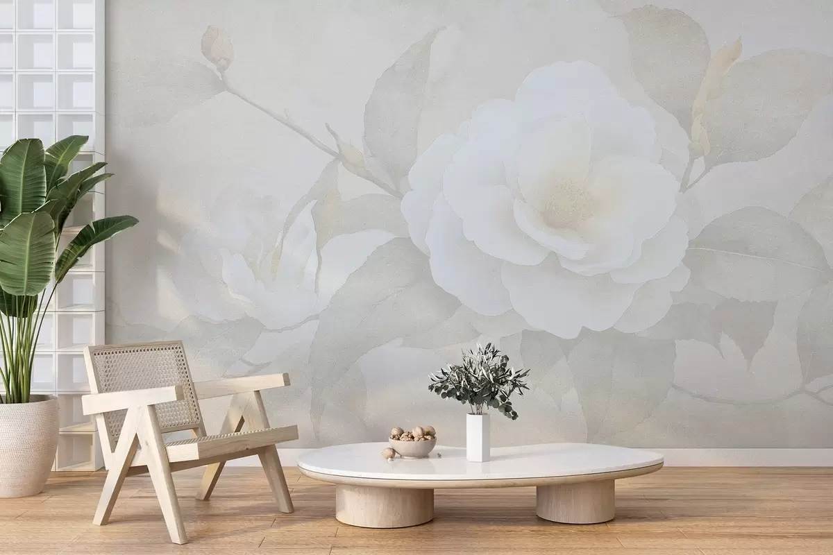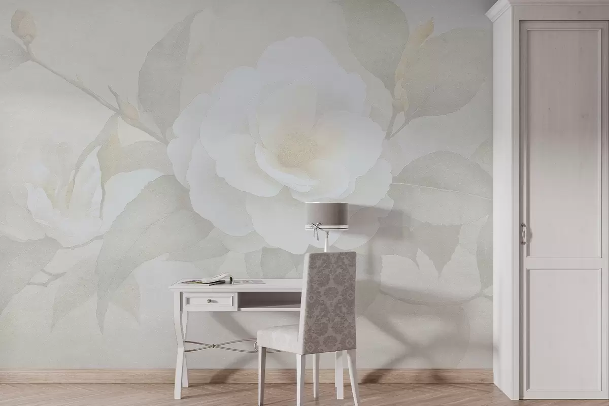 Soft pastel with camellia flowers on the branch, beige colors - Wall mural (No. w03760)