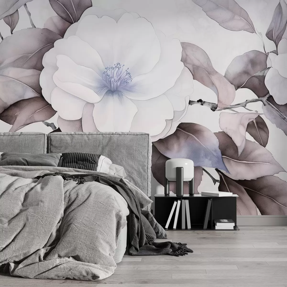 Watercolor style camellia flowers on the branch, purple colors - Wall mural (No. w03761v1)