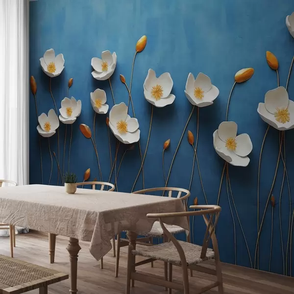 White flowers with yellow centres on a blue background - Wall mural (No. w03800)