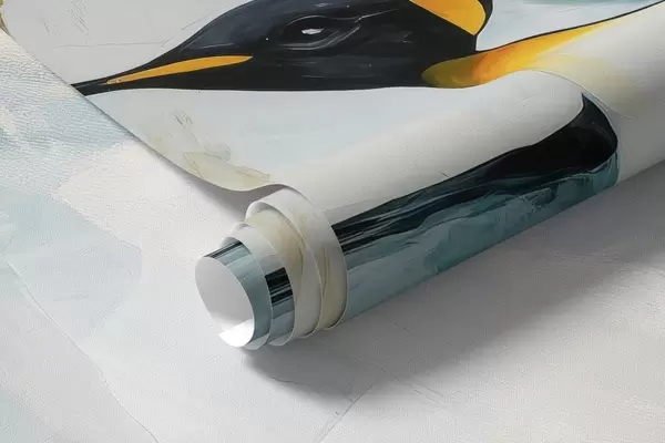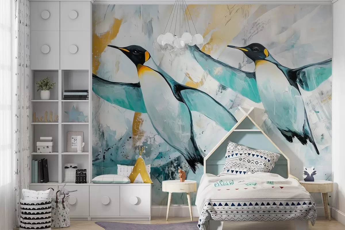 Cute penguins, Antarctic, blue ice, animals, oil style drawing - Wall mural (No. w03883)