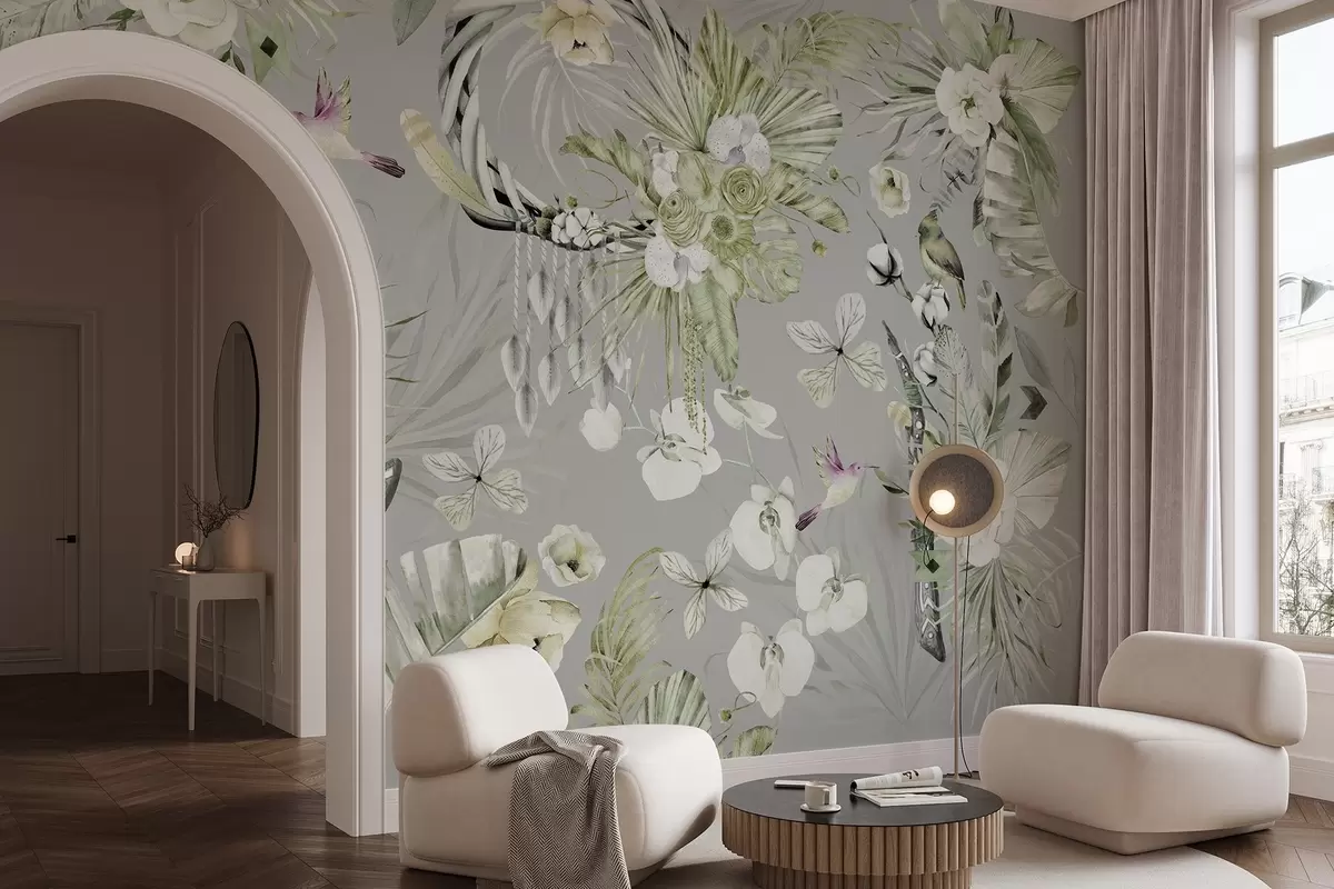 Boho style ornament with peony flowers and birds, watercolor style, green colors - Wall mural (No. w03885v2)