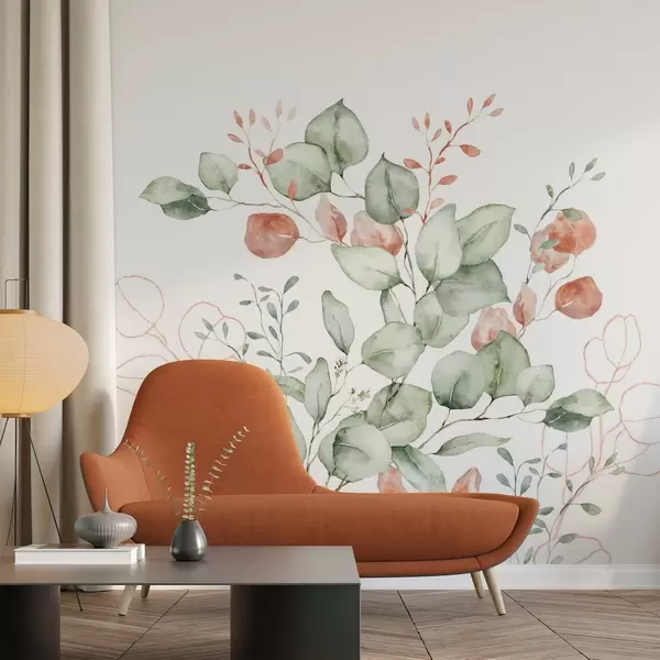 Vegetation and branches imitation of textured watercolor, shades of green and red - Wall mural (No. w03927v1)