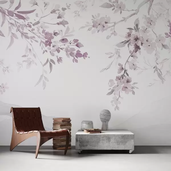Flowering branches, imitation of watercolor, purple-pink shades - Wall mural (No. w03935v1)