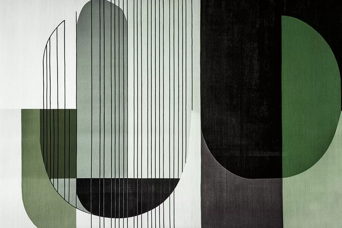 modern abstract geometric composition with overlapping shapes and vertical line patterns, thin lines filling trapezoids and ovals, soft textile texture overlay, warm muted tones like olive green, taupe, beige and charcoal, subtle transparency effects between shapes - Wall mural (No. w03937v3)