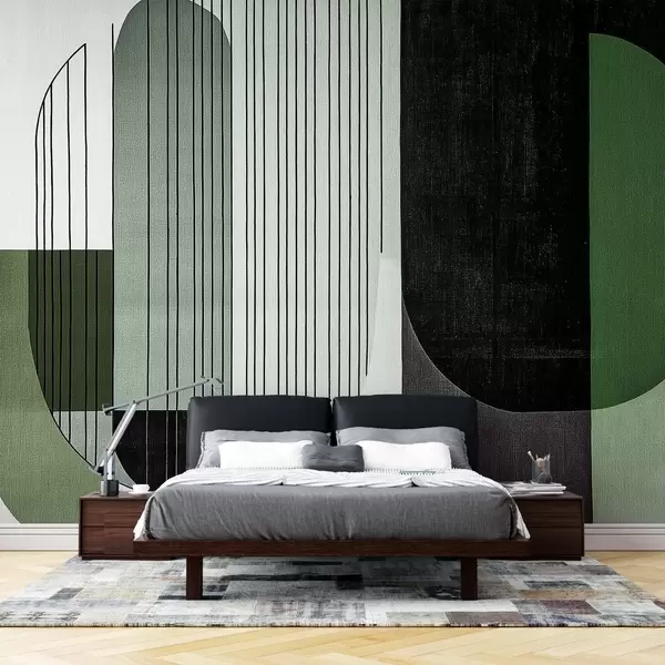 modern abstract geometric composition with overlapping shapes and vertical line patterns, thin lines filling trapezoids and ovals, soft textile texture overlay, warm muted tones like olive green, taupe, beige and charcoal, subtle transparency effects between shapes - Wall mural (No. w03937v3)