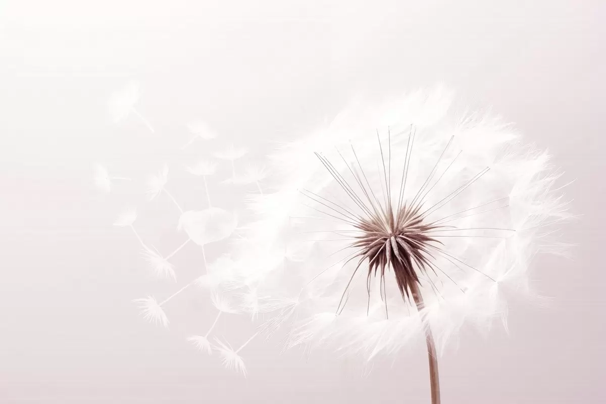 Modern soft floral composition with a fully bloomed dandelion head and floating seeds, set against a delicate textile-like texture - Wall mural (No. w03939v2)