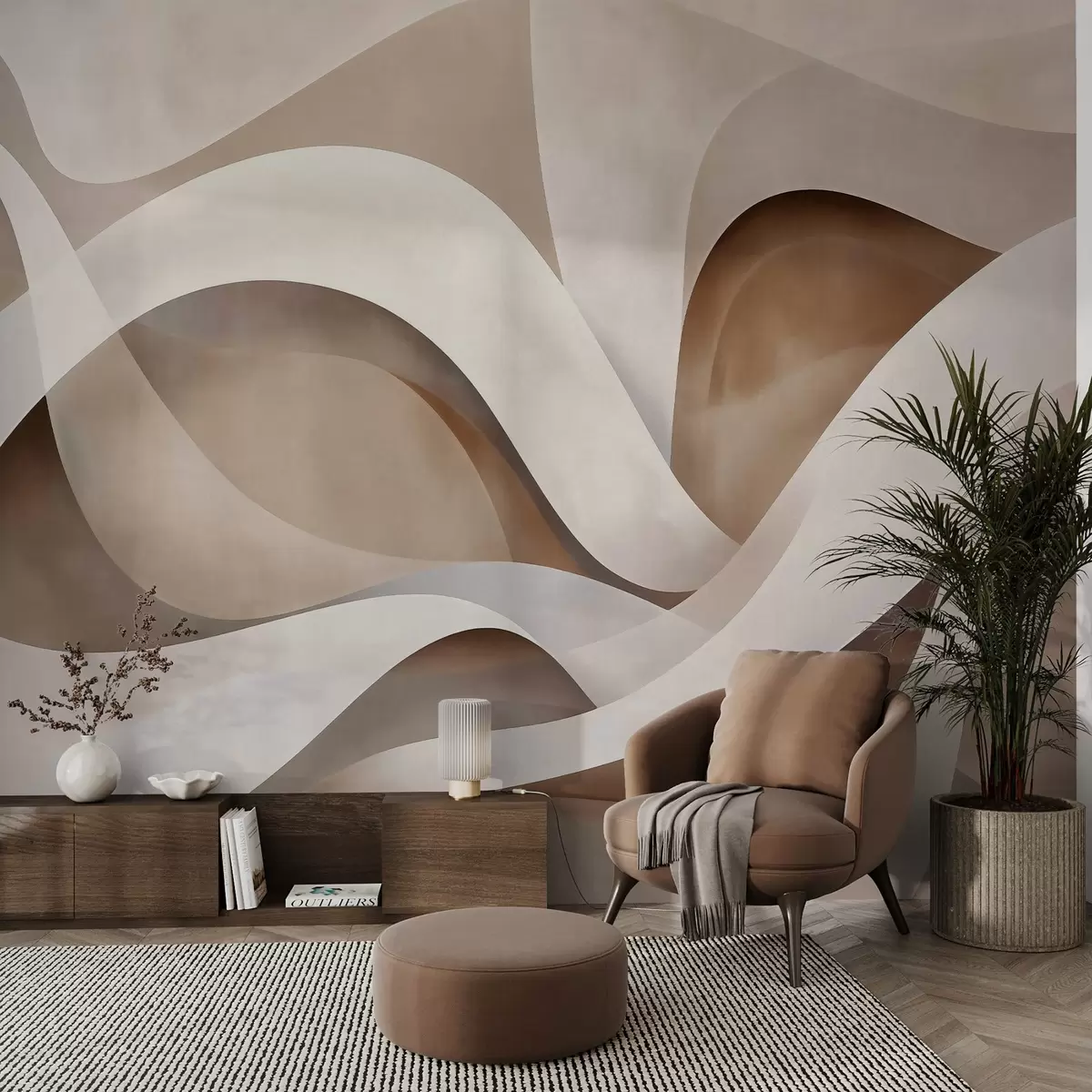 abstract minimalist composition of layered organic shapes, each outlined with a soft white edge, filled with dense internal linear strokes, like fabric or paper texture, flowing curves in neutral beige, sand, stone and ivory tones, embossed appearance - Wall mural (No. w03940v1)