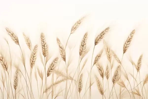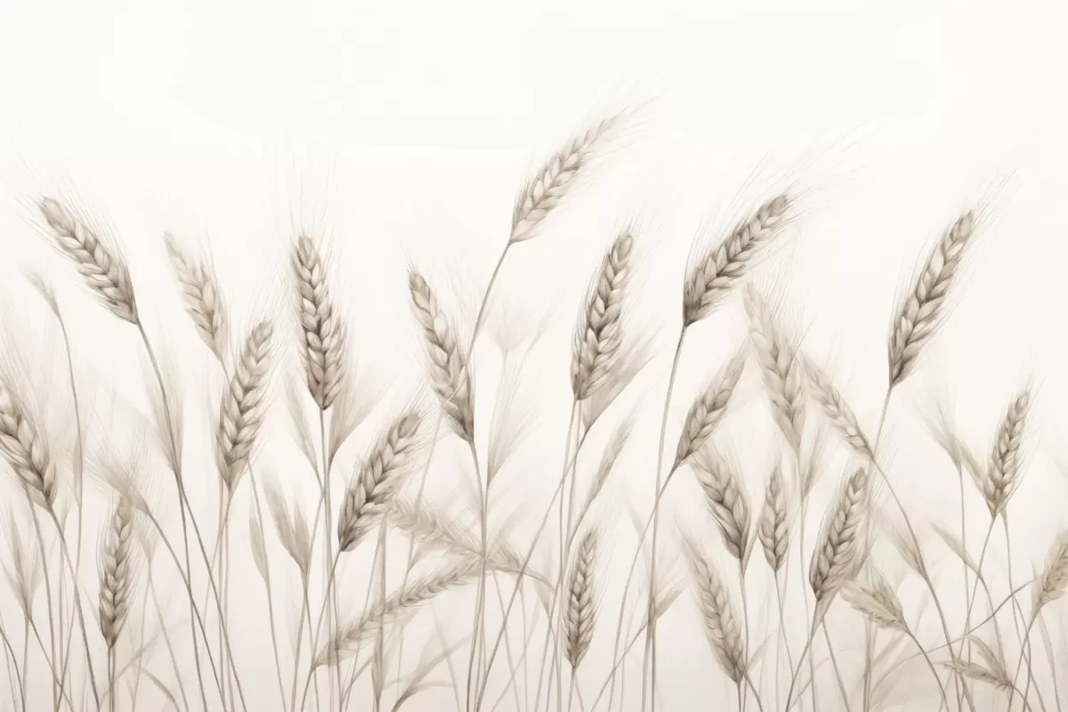 delicate botanical illustration of wheat stalks, hand-drawn style, fine lines with pastel chalk texture, soft sepia and earthy brown tones, white background, symmetrical elegant composition, natural sketch aesthetic - Wall mural (No. w03943v1)