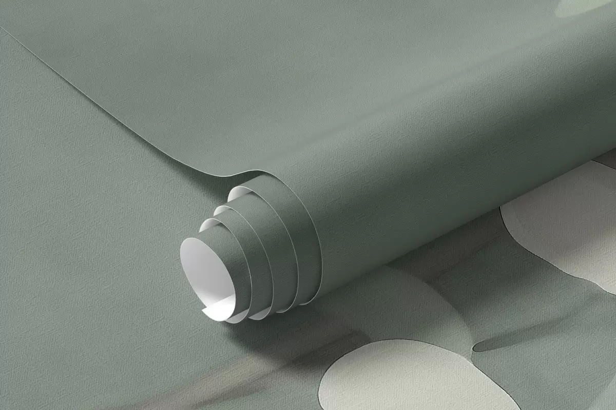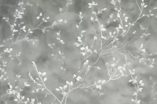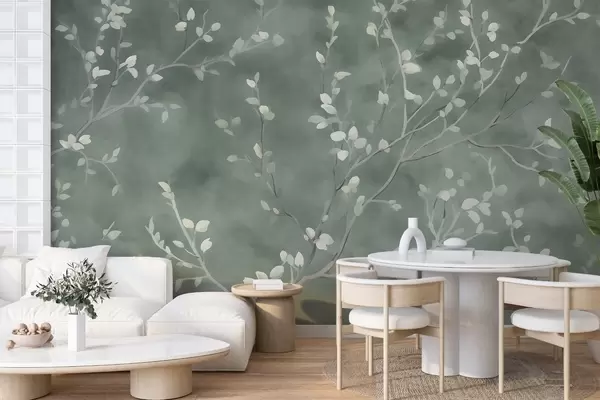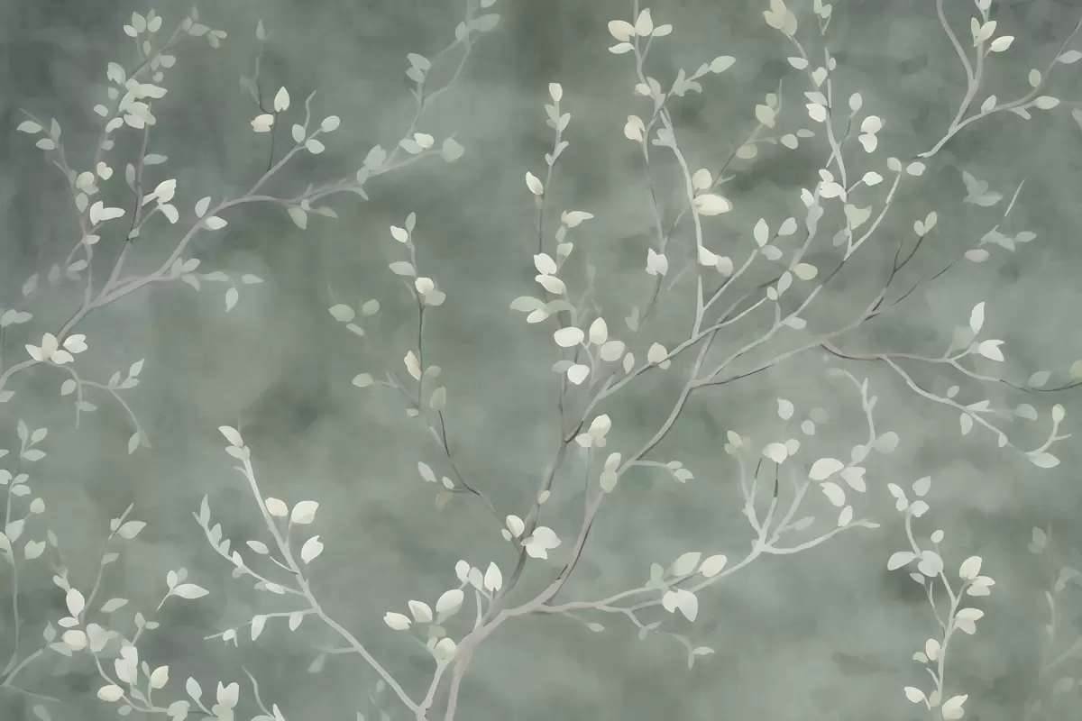 minimalist hand-painted wallpaper design of soft white tree branches with delicate leaves, branching organically across a muted sage green background, fine botanical linework in natural flow - Wall mural (No. w03949)