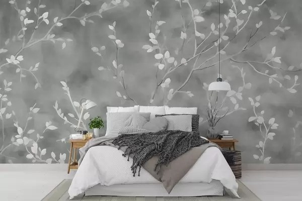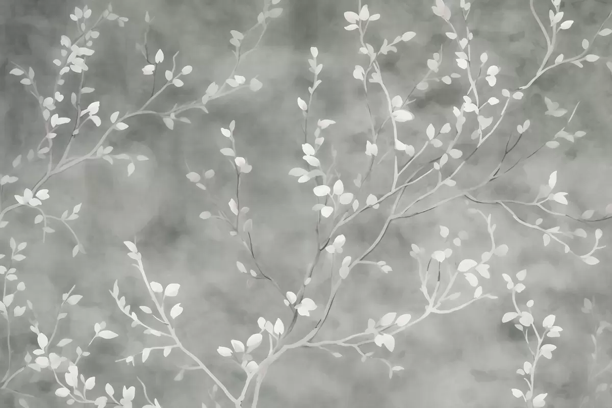 minimalist hand-painted wallpaper design of soft white tree branches with delicate leaves, branching organically across a muted sage green background, fine botanical linework in natural flow - Wall mural (No. w03949v2)