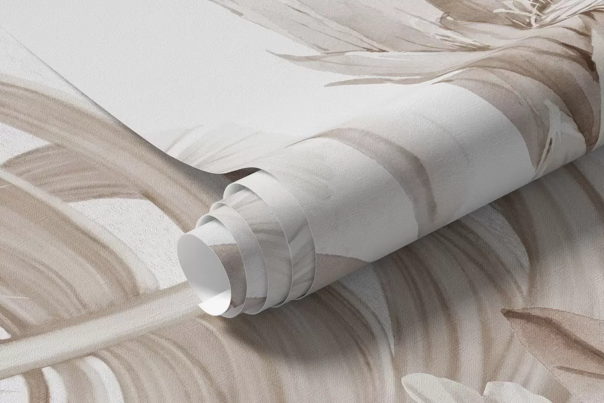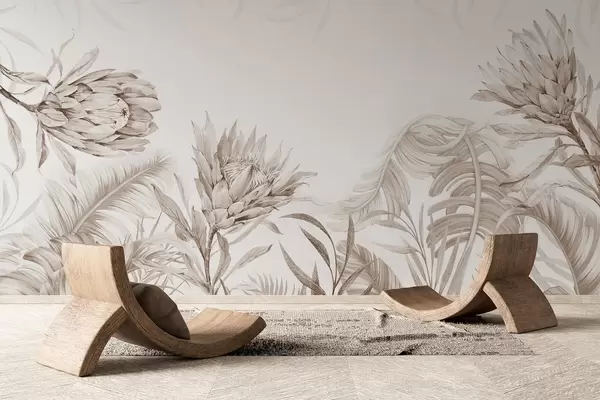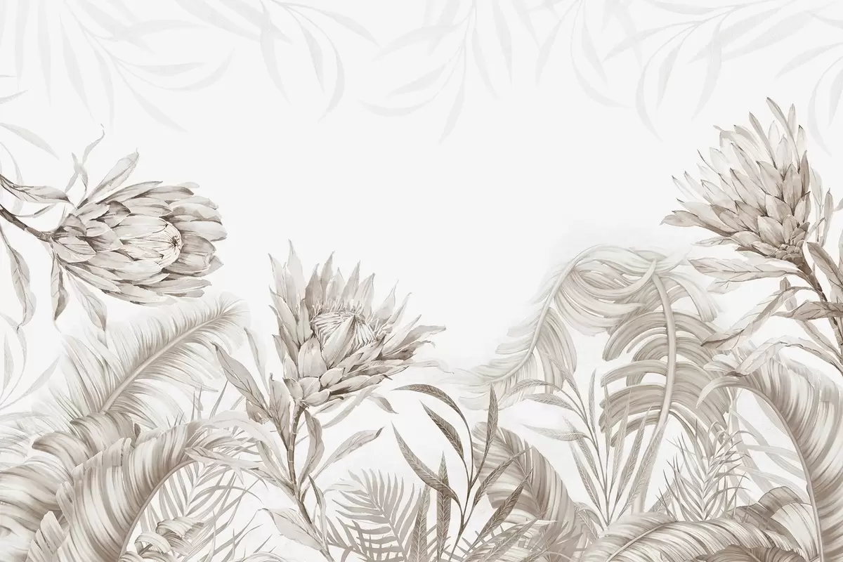 Protea among tropical leaves, beige shades - Wall mural (No. w03952)