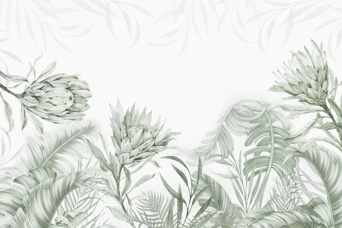 Protea among tropical leaves, blue shades - Wall mural (No. w03952v3)