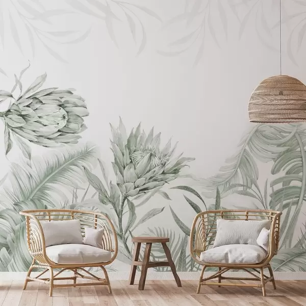 Protea among tropical leaves, blue shades - Wall mural (No. w03952v3)