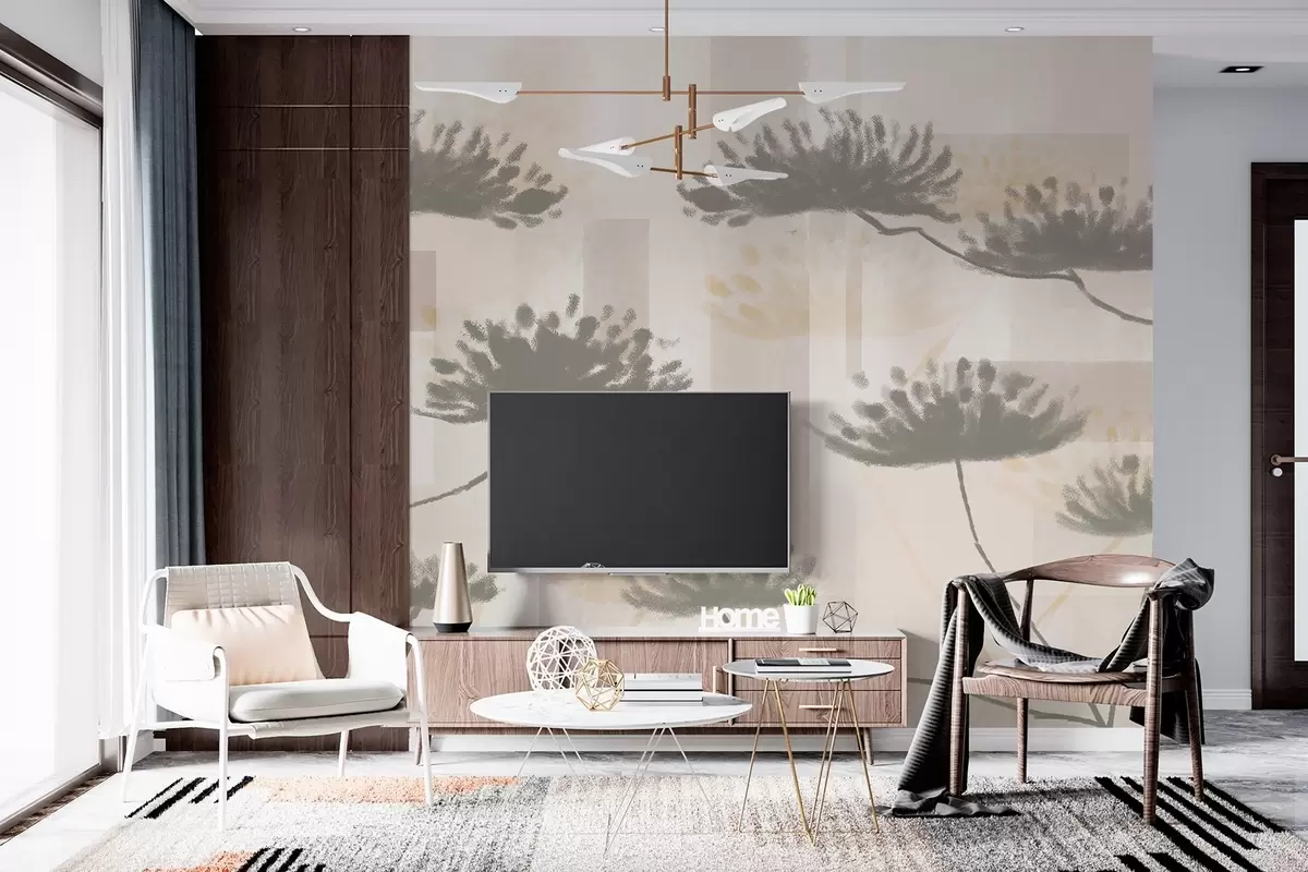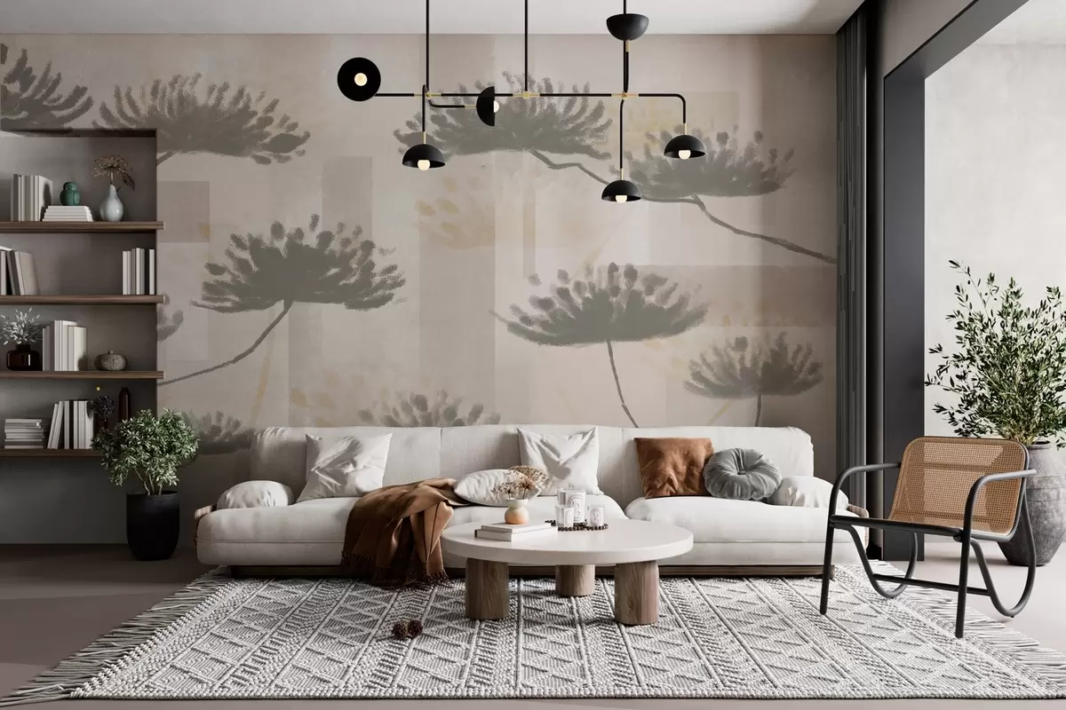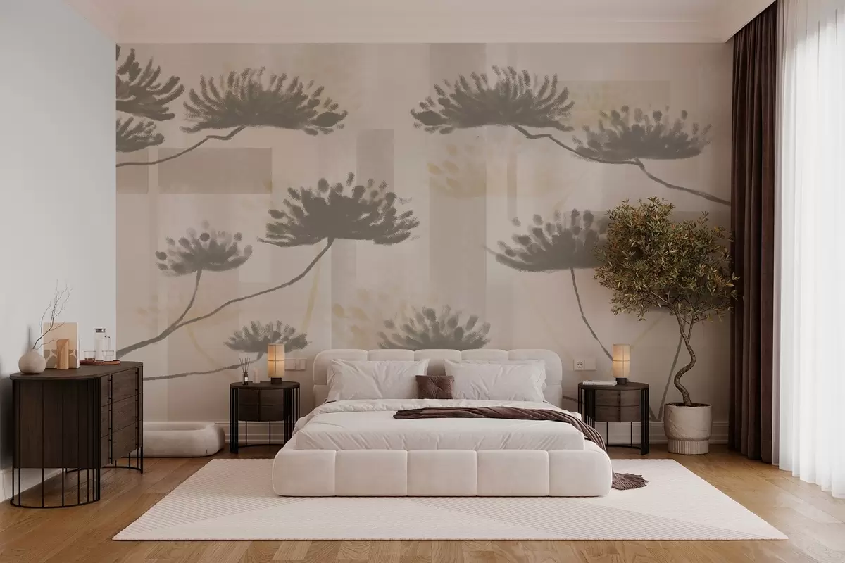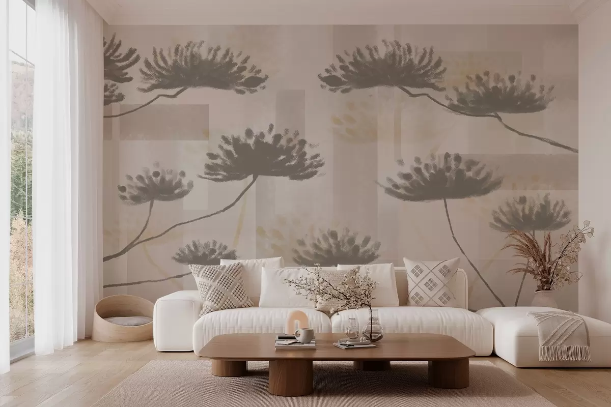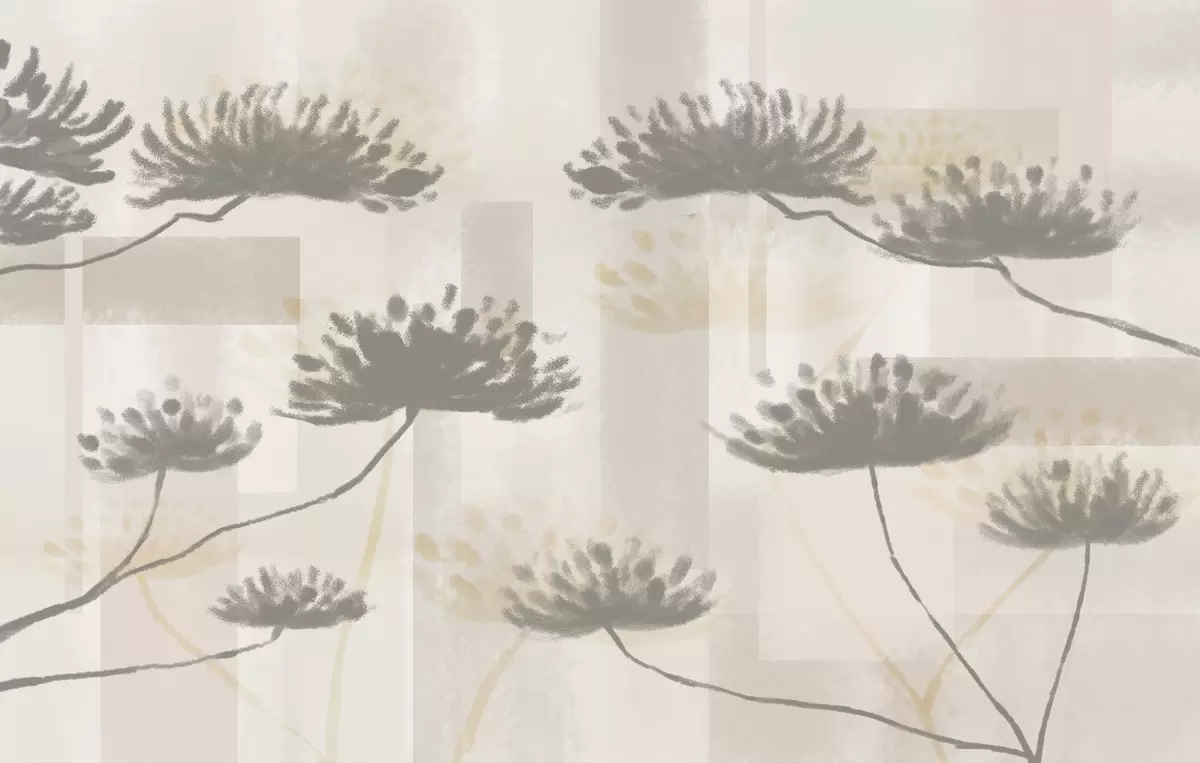 textured geometry in beige and cream tones with stylized umbrella flowers - Wall mural (No. w03960)