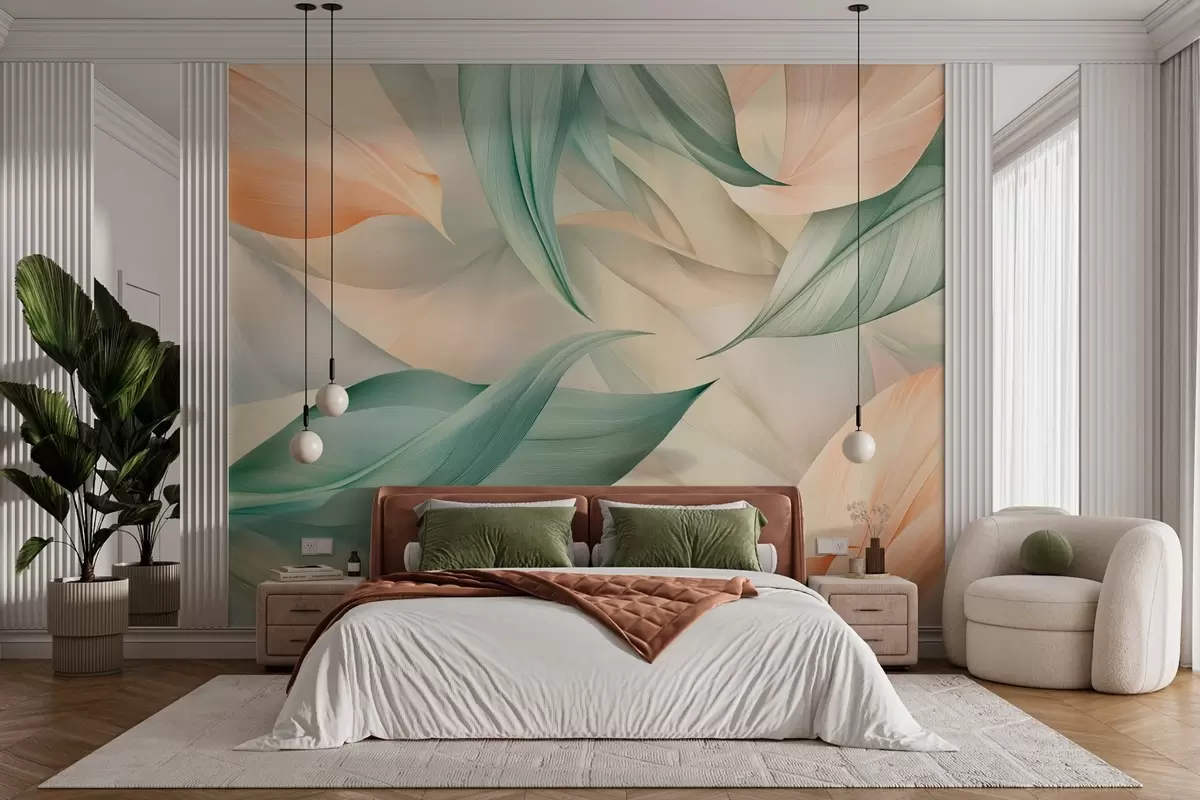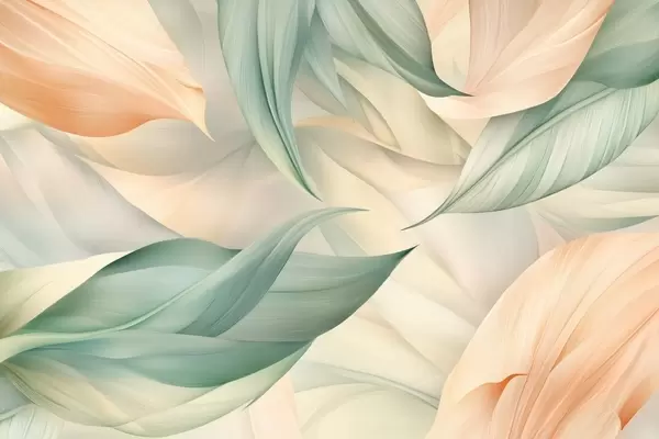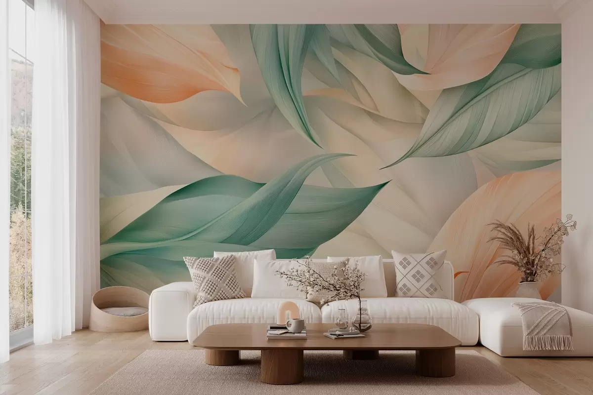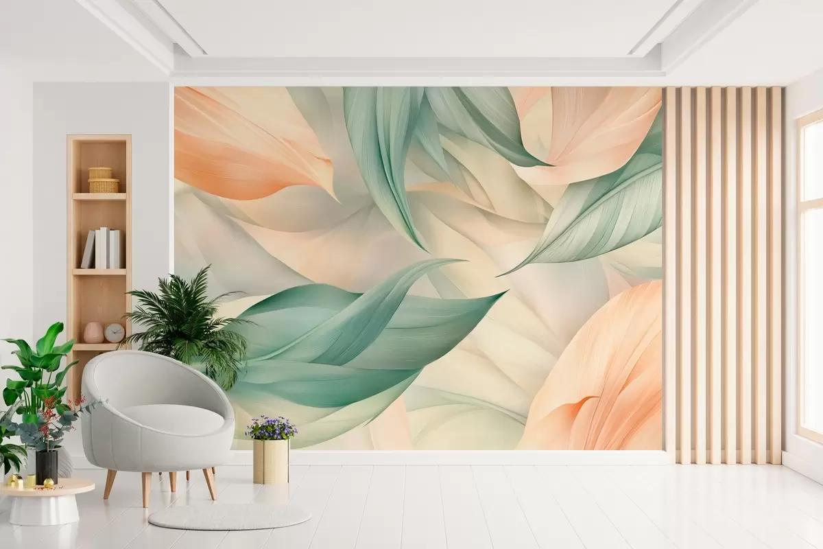 exotic tropical leaves in delicate peach and green tones - Wall mural (No. w03962)