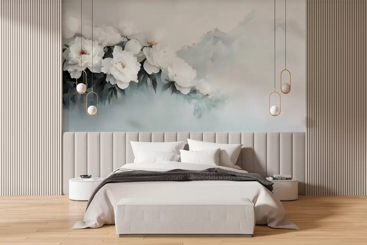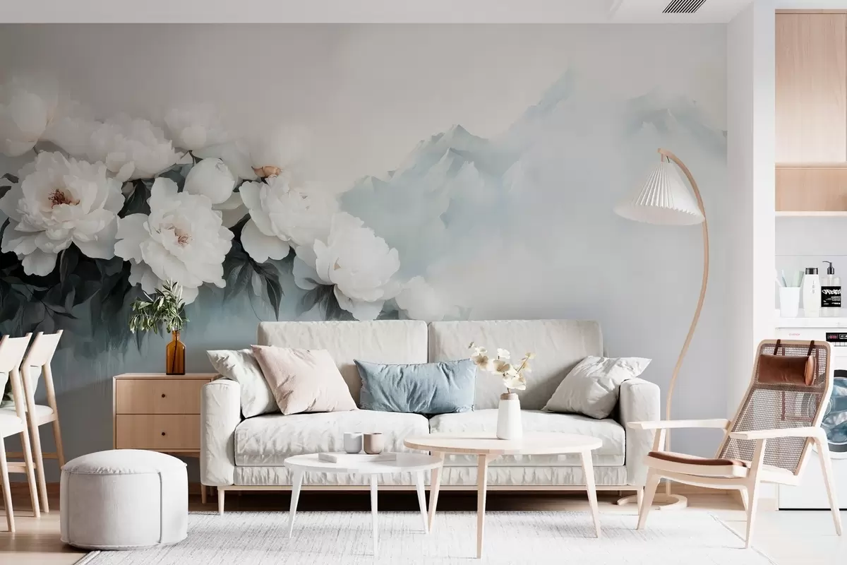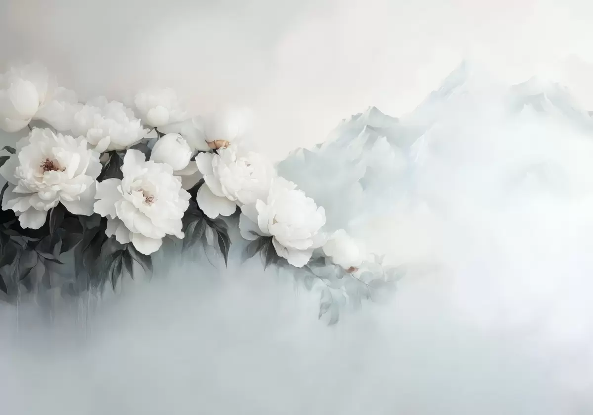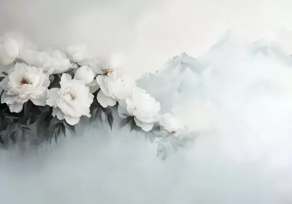 picturesque lush white peonies against the backdrop of foggy mountains - Wall mural (No. w03965)