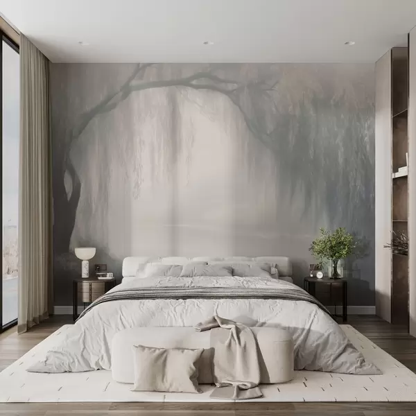 Mystical willow bank in the morning fog - Wall mural (No. w03995)