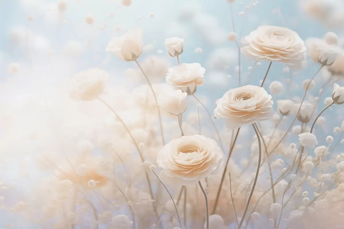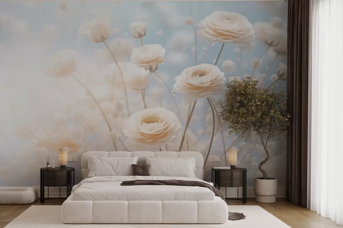 Delicate cream roses on a light blue background - Wall mural (No. w03997)