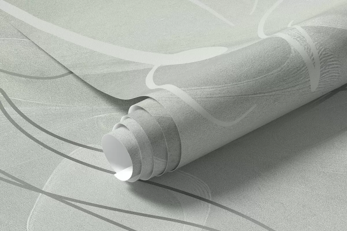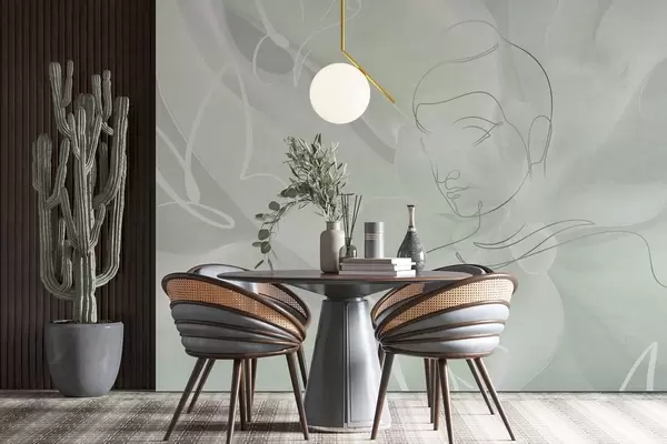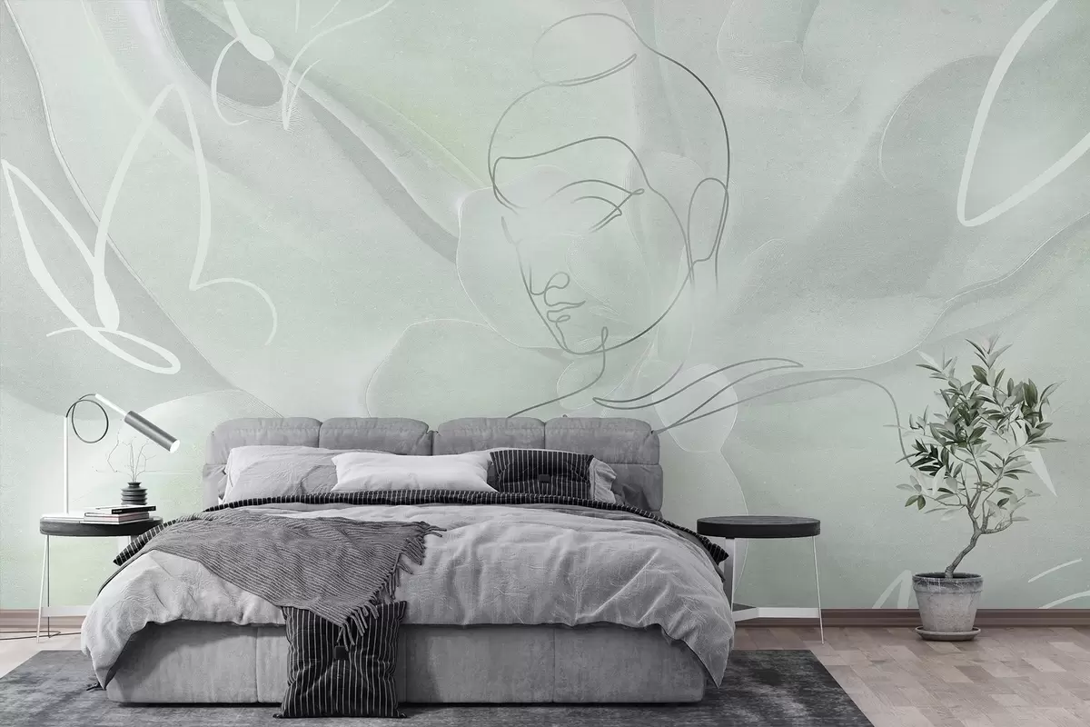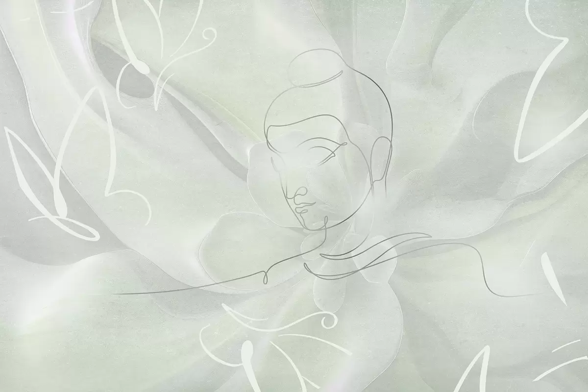 Floral abstraction with Buddha line drawing, green colors - Wall mural (No. w04004v3)