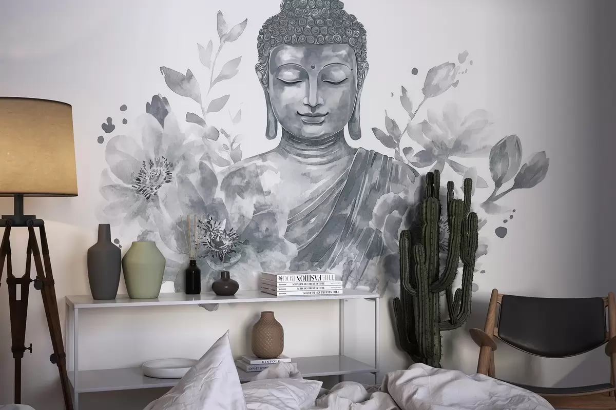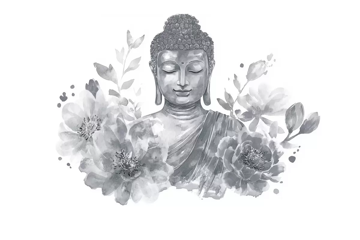 Watercolor Buddha with flowers, spiritual, grey color palette - Wall mural (No. w04005v1)
