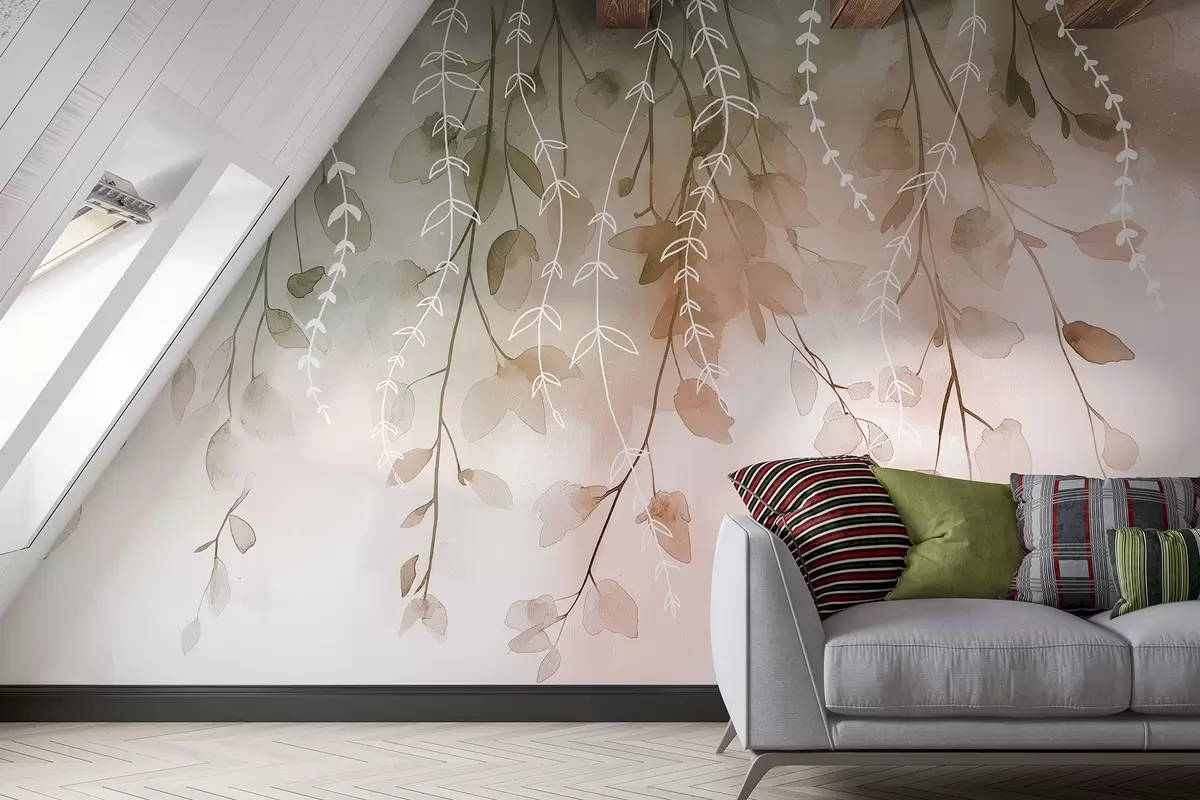 Branches with leaves in watercolor style, natural autumn colors - Wall mural (No. w04007v1)