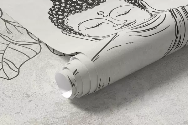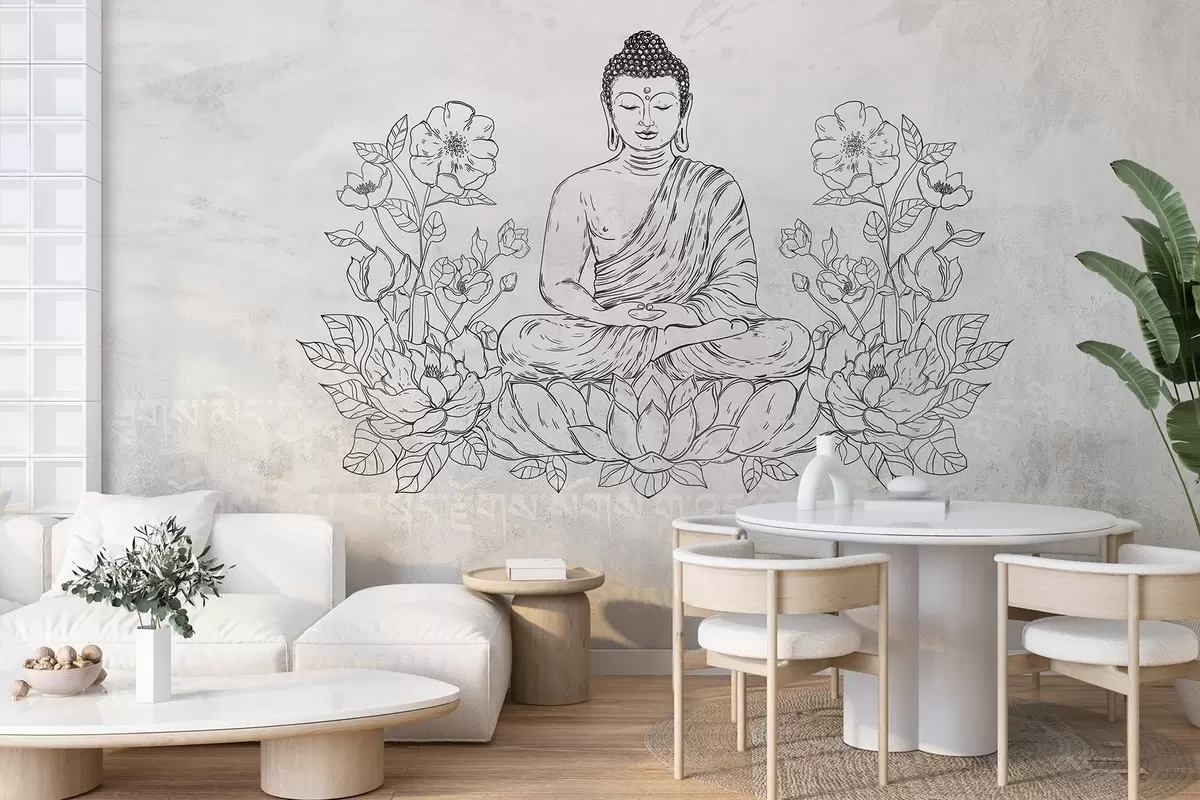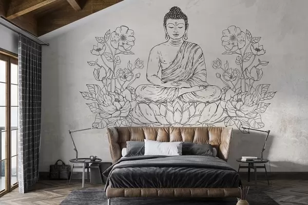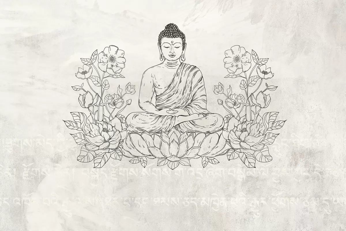 Meditating Buddha with lotus flowers, line art, oriental, beige background - Wall mural (No. w04008v1)