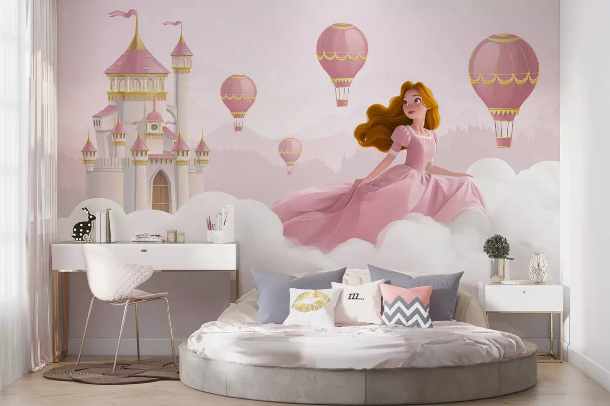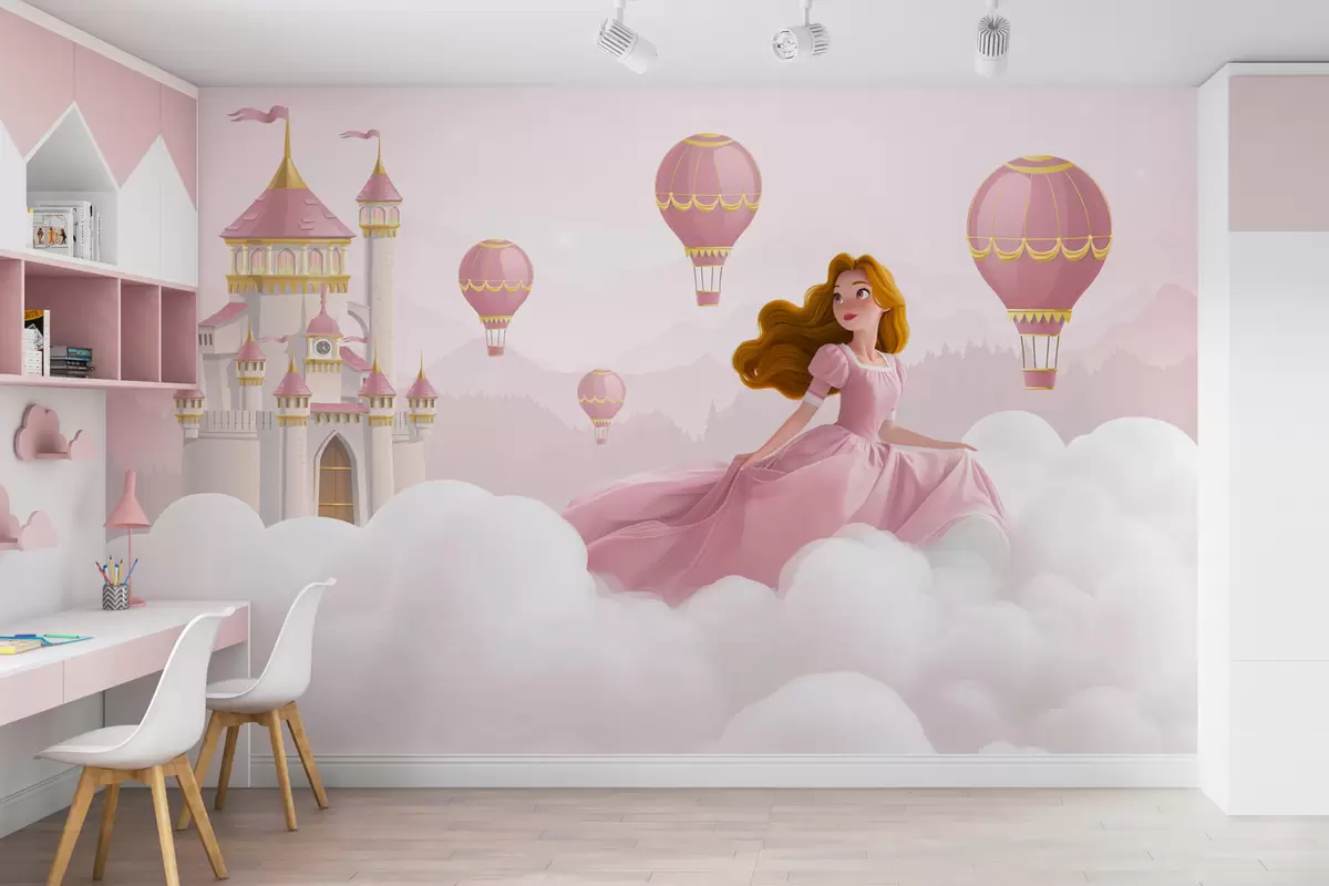 Princess among the clouds on the background of the landscape with the castle - Wall mural (No. w04015v1)