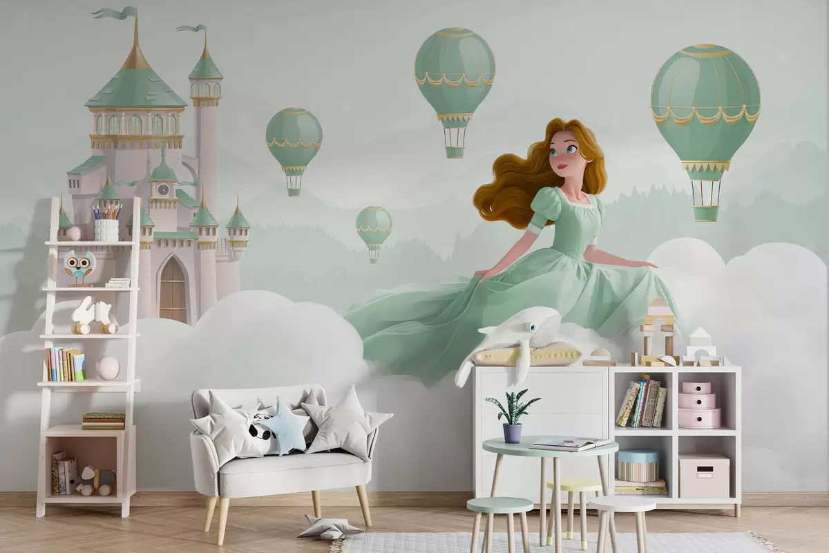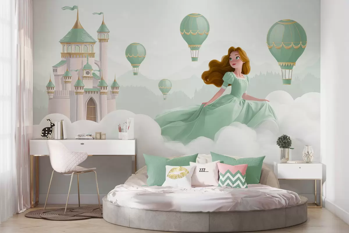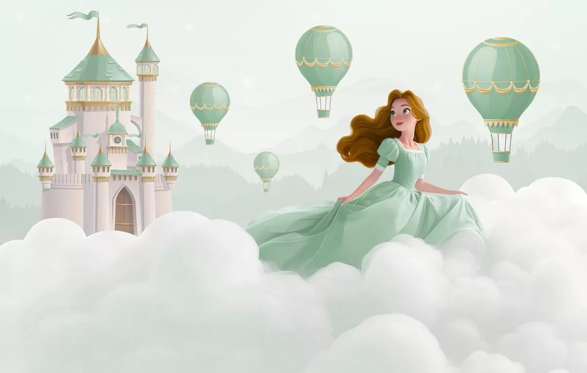 Princess among the clouds on the background of the landscape with the castle - Wall mural (No. w04015v2)
