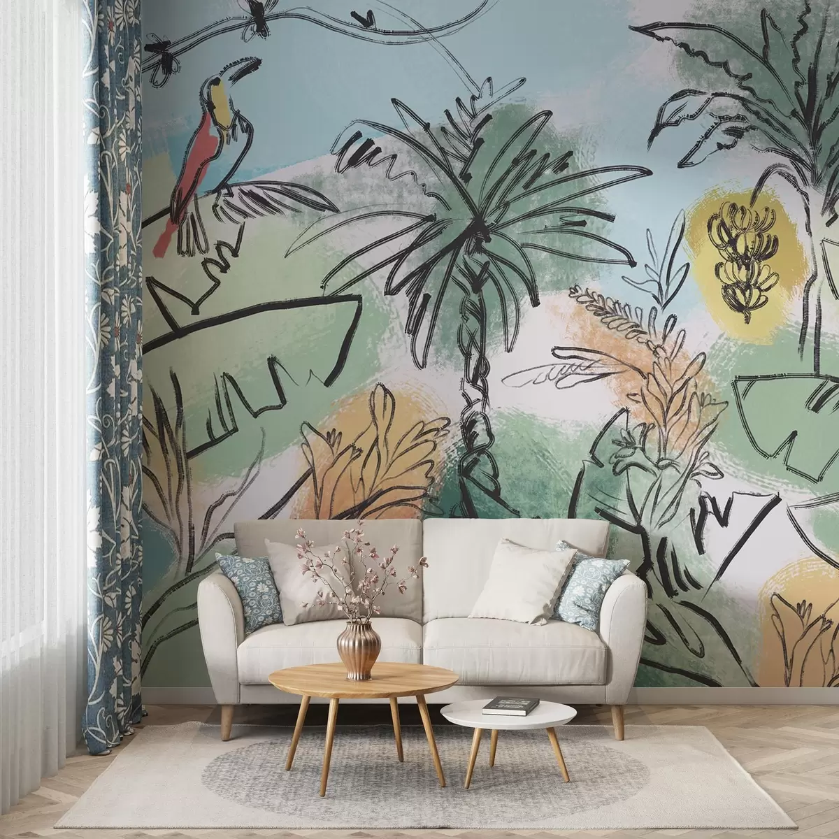 Tropical print with parrots, rich colours, tropics - Wall mural (No. w04019)