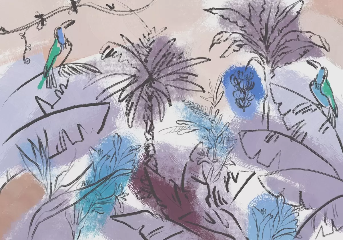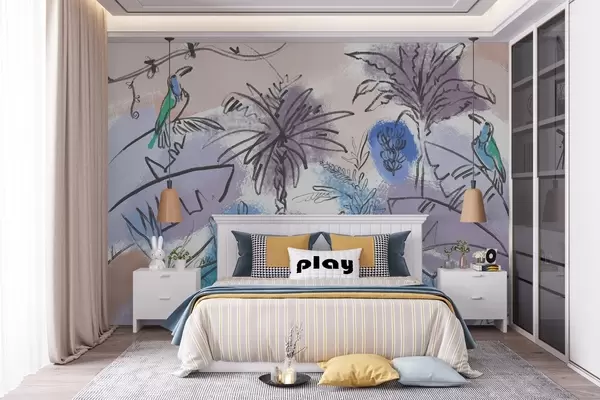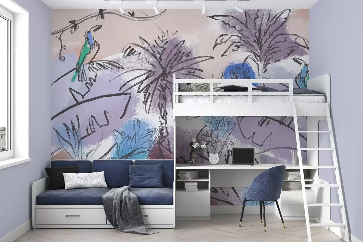 Tropical print with blue flowers, picturesque parrots - Wall mural (No. w04019v2)