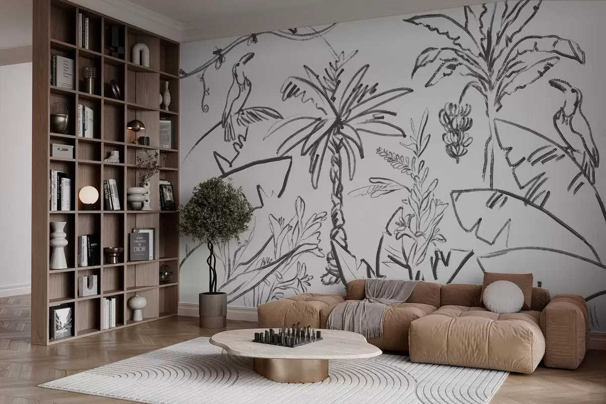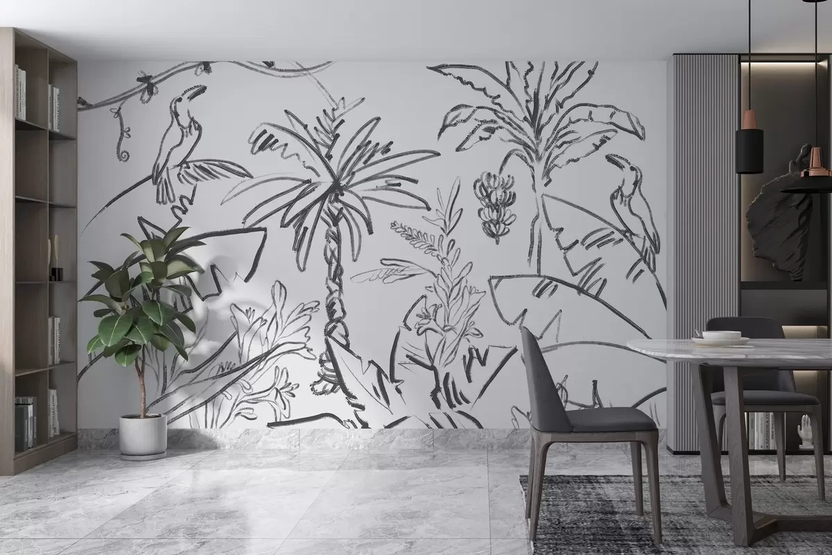 Tropical line drawing, bananas, palm trees, outline graphics - Wall mural (No. w04020)