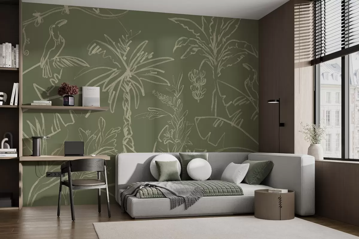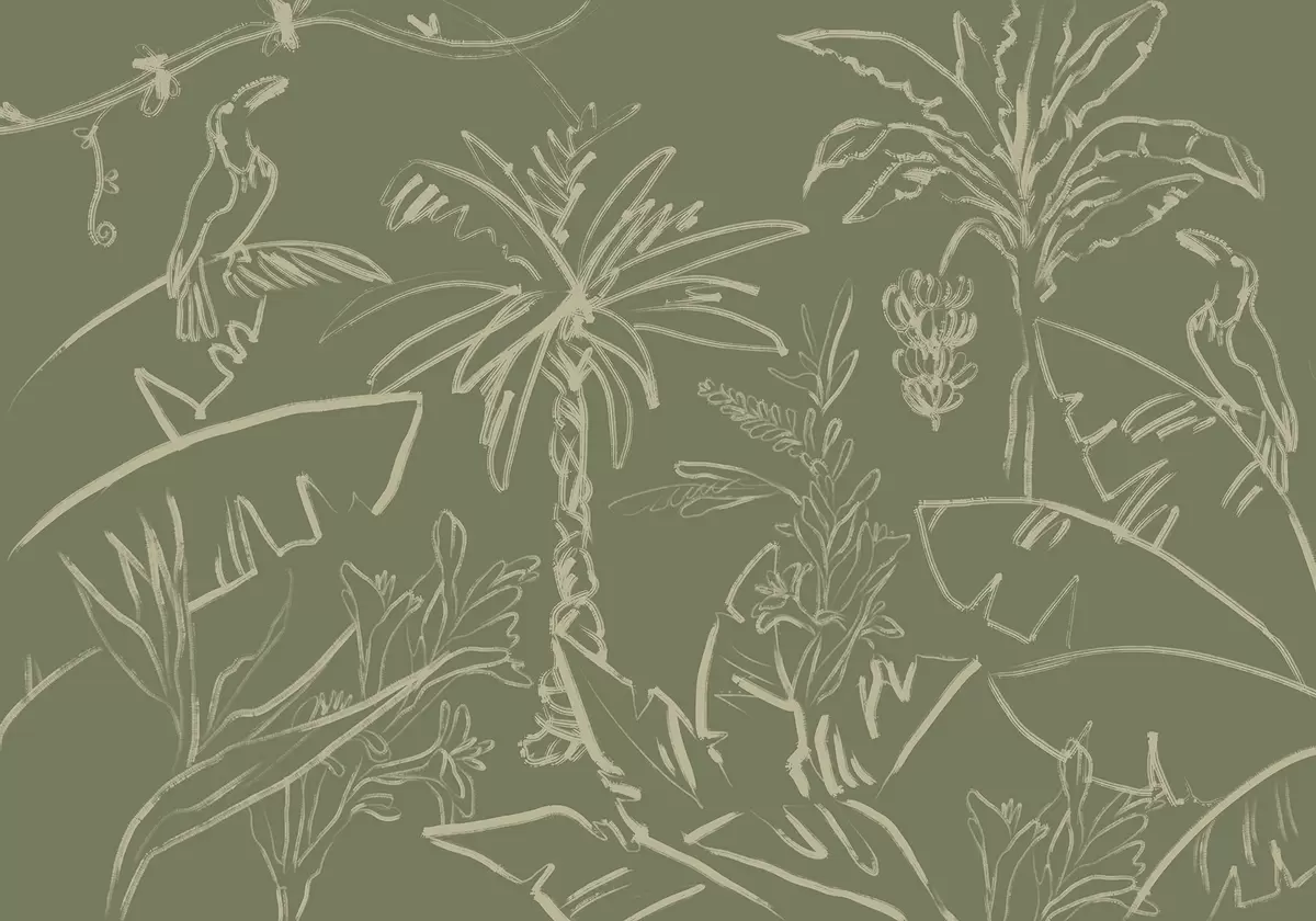 Tropical pattern on green background, palm trees, bananas - Wall mural (No. w04020v6)