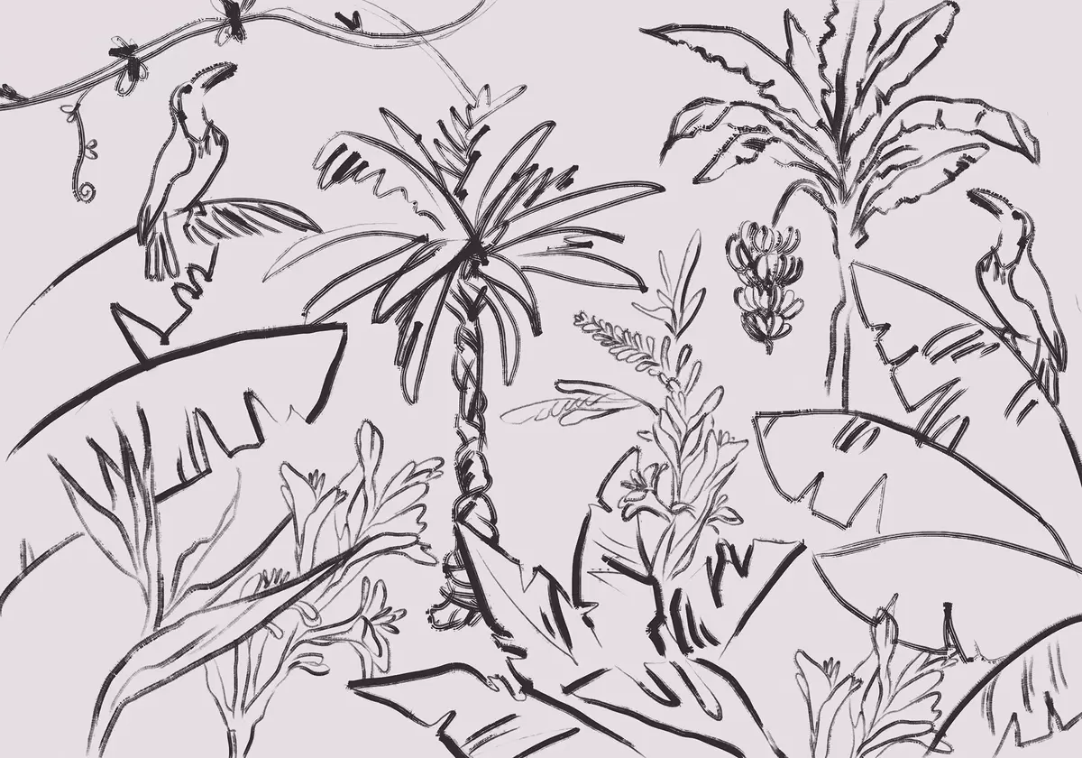 Tropical pattern in black colour, palm trees, bananas, outline graphics - Wall mural (No. w04020v7)