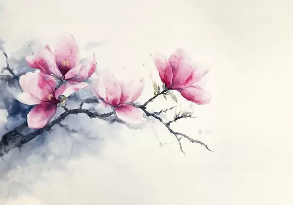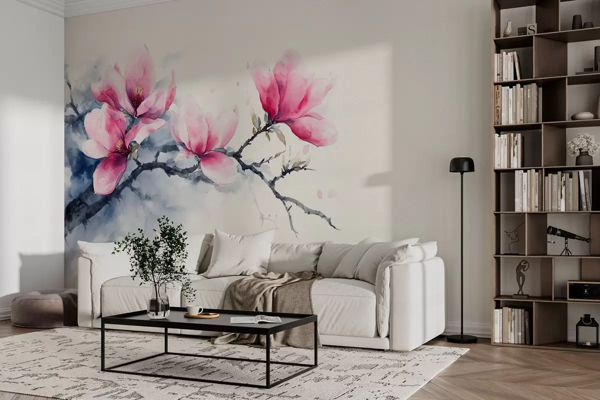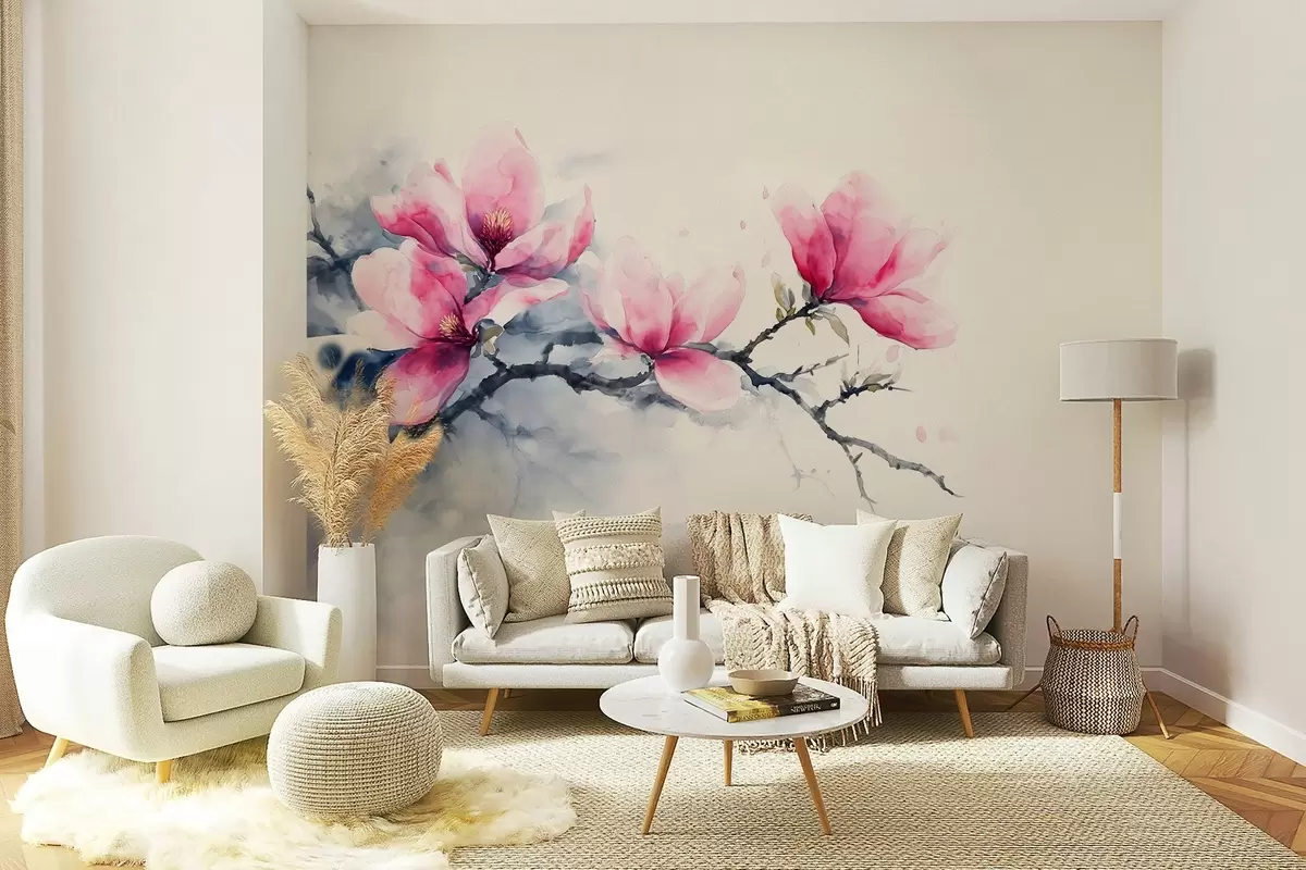 blooming branch of pink magnolia on an ivory background - Wall mural (No. w04027)