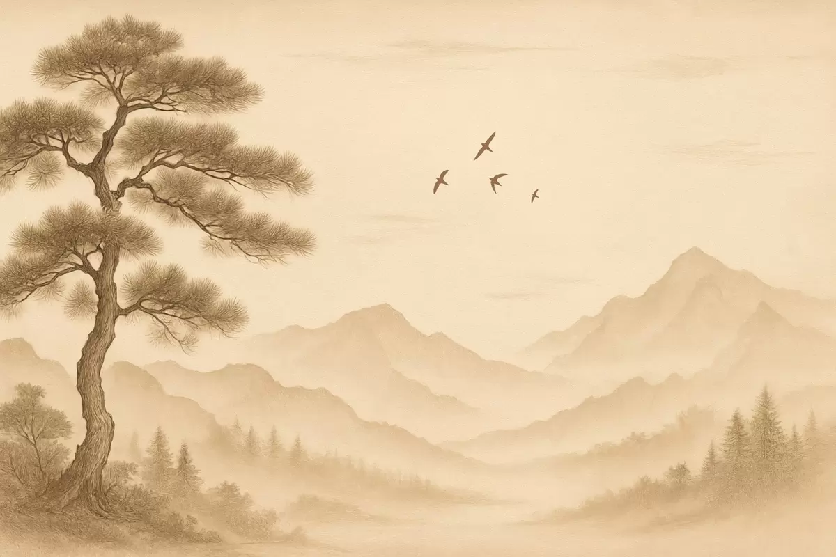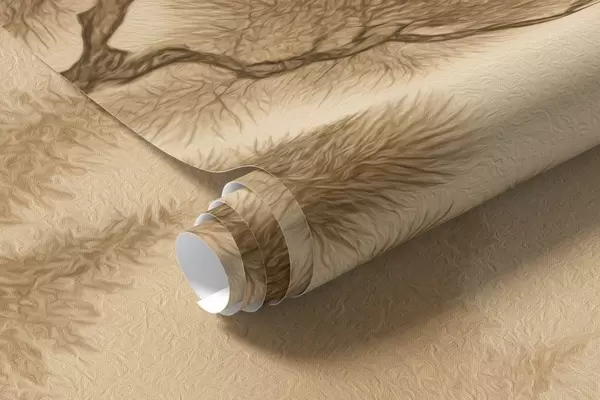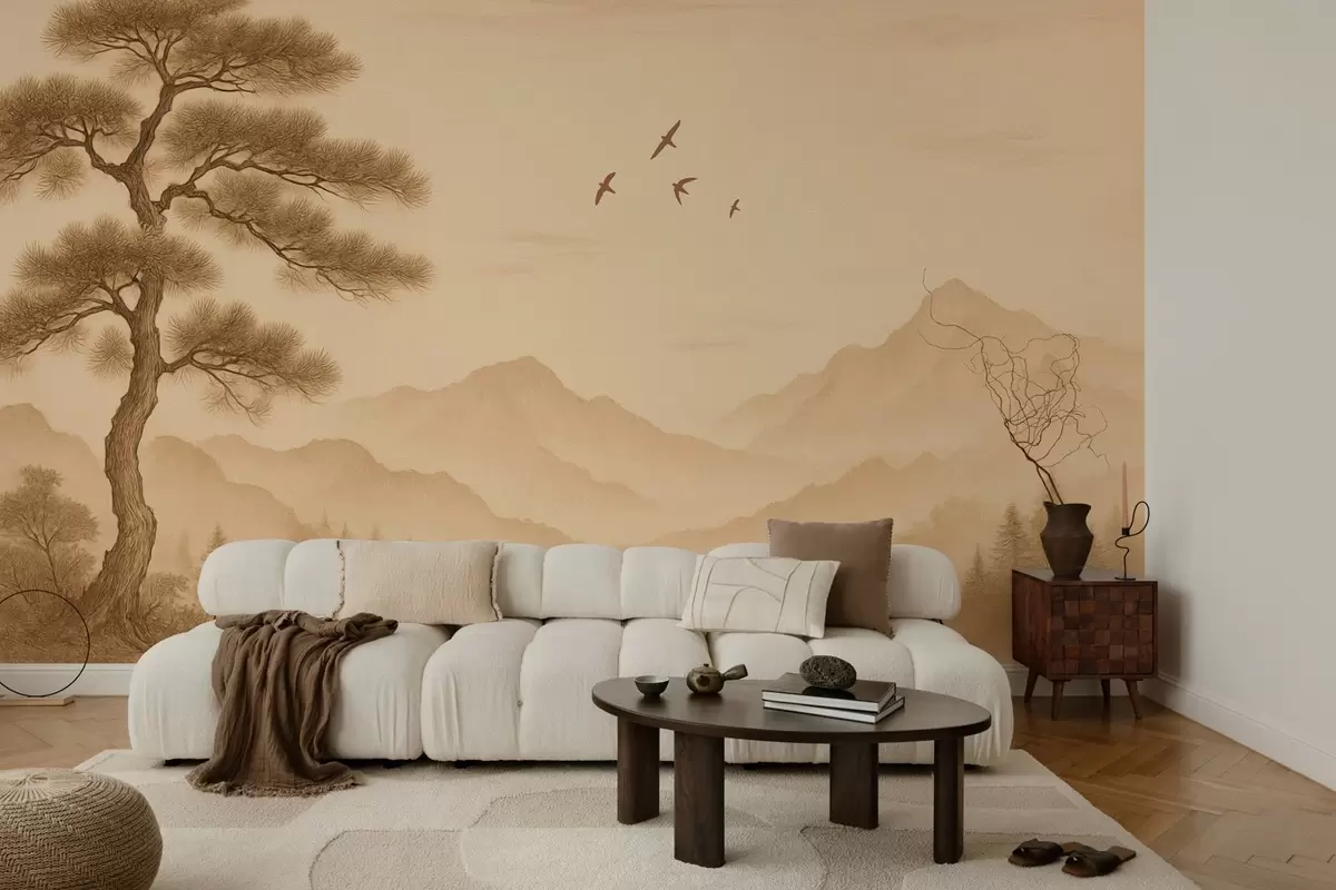 panorama of the hills with a large tree in sepia style - Wall mural (No. w04033)