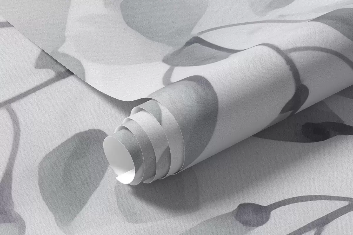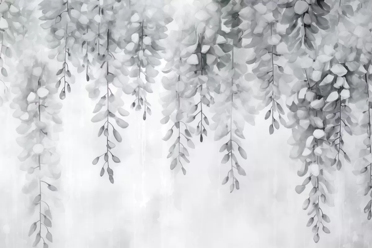 Monochrome watercolor with cascading wisteria in cool silver and white tones, evoking stillness and winter softness - Wall mural (No. w04034v1)