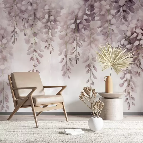 Soft watercolor scene in creamy pink tones, with cascading wisteria clusters forming a dreamy floral curtain - Wall mural (No. w04034v2)